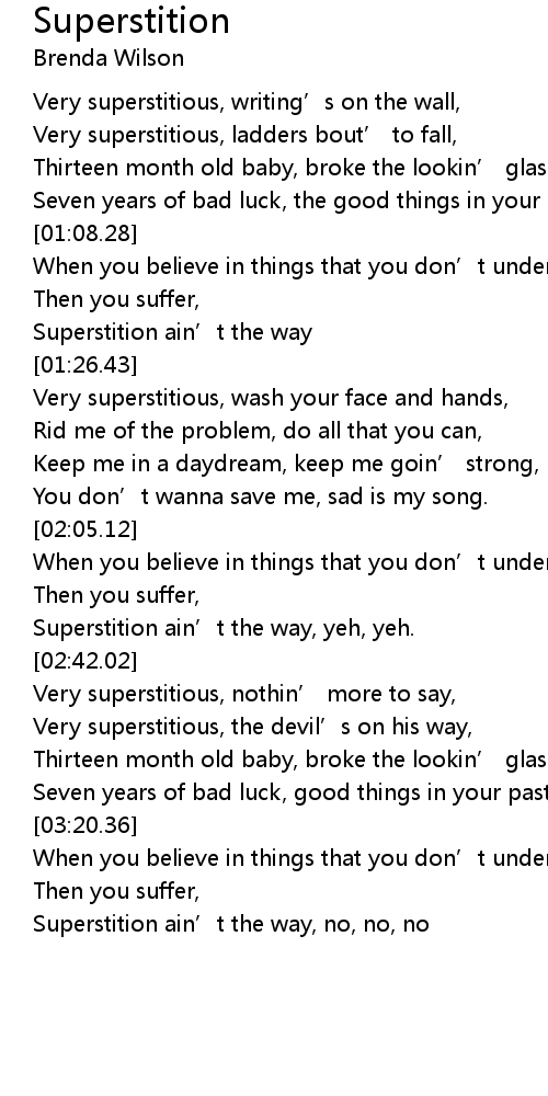 , Download free karaoke player: https://alpaca-player.com/ Lyrics: Very superstitious, writings on the wall, Very superstitious, . "Stevie Wonder - Superstition (lyrics)", Stevie Wonder Superstition lyrics Very superstitious, Writing's on the wall, Very superstitious, Ladders bout' to fall, Thirteen month . If you're searching for Superstition Lyrics theme, Stevie Wonder Superstition, Stevie Wonder Superstition.. you have visit the ideal blog. Our site always gives you hints for seeing the highest quality picture content, please kindly hunt and locate more enlightening articles and pics that fit your interests.